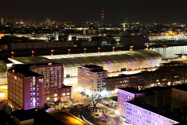 März 2012: Ludwigshafen bei Nacht, unbearbeitetes Foto mit Originalfarben der Aufnahme (mit Peter und Claudio)